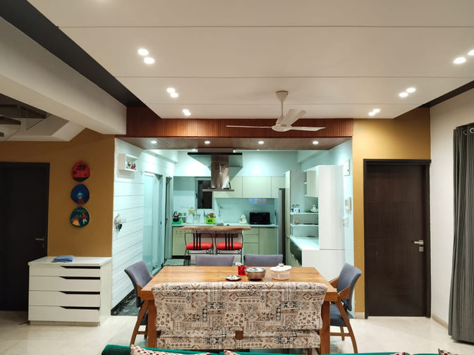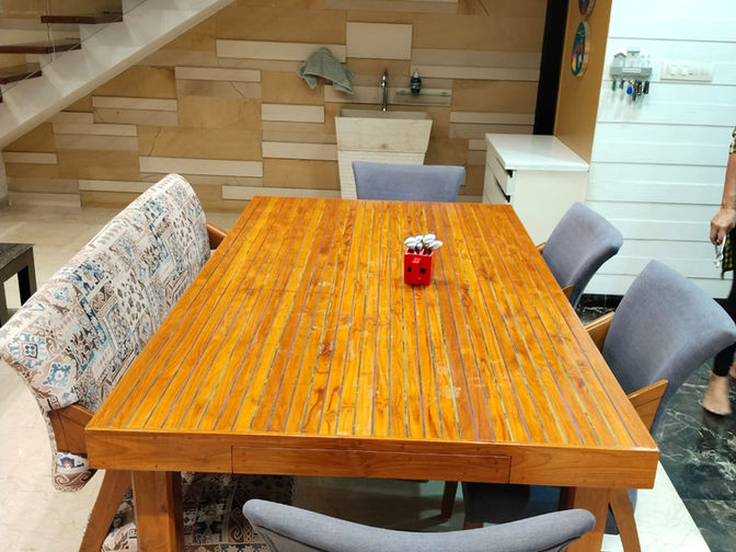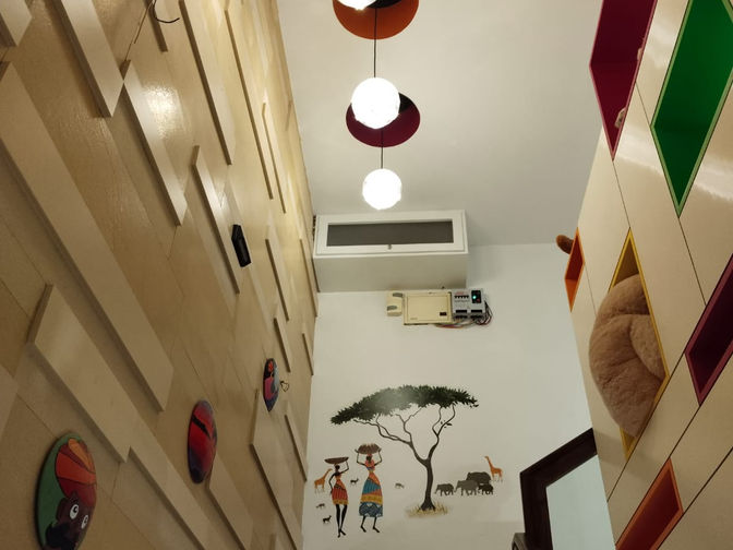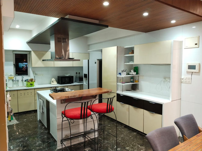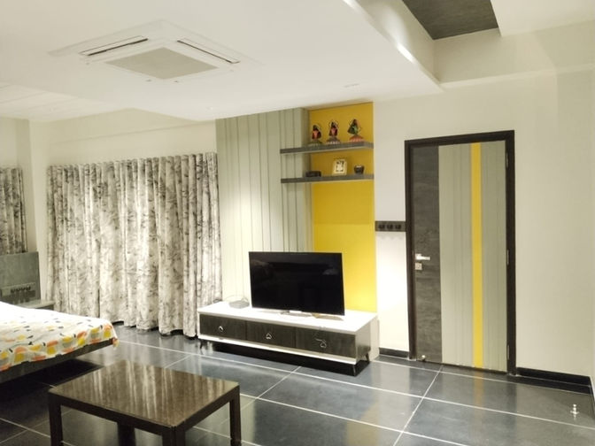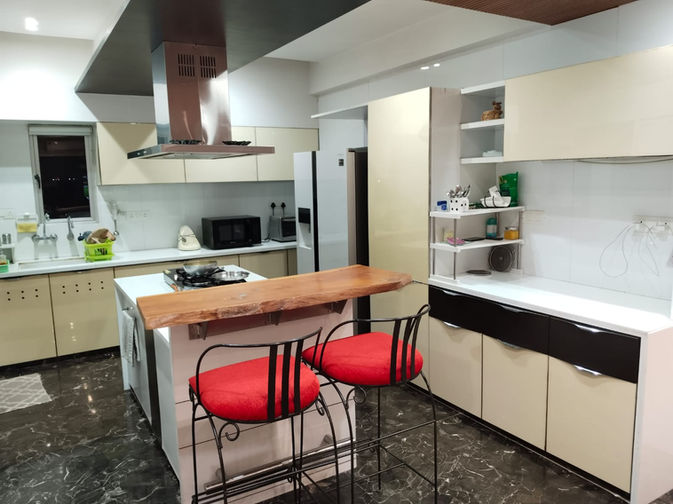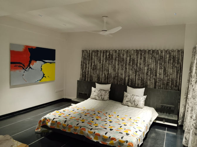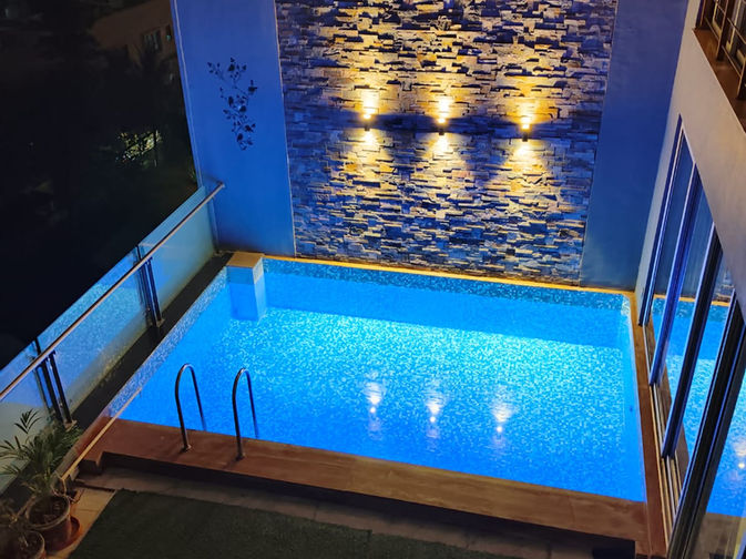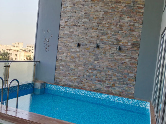 A three BHK, fully-furnished duplex apartment with an in-house swimming pool (4’ depth) and a large balcony. The apartment has a carpet area of 2900 sq. ft. and a super build-up area of 3800 sq. ft. Fully furnished includes all the furniture and the air-conditioners. There is an individual solar panel set-up on the terrace. There is also provision of an inverter.